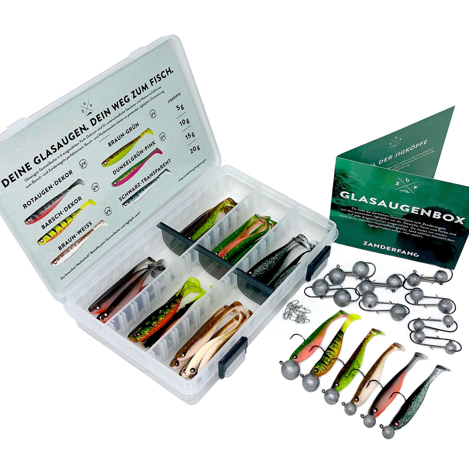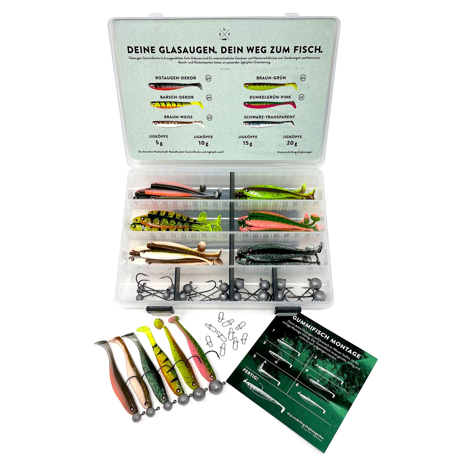 Wenn es auf Zander gehen soll, brauchst du nichts mehr als die Glasaugenbox. Wähle deine Größe und ab ans Wasser! Die Gummifische und Jigköpfe sind in der Gummifisch Box perfekt aufeinander abgestimmt. Die robusten Snaps zum Angeln passen perfekt zu den Jigköpfen. Mit der GLASAUGENBOX bist du bei jedem Wetter und Wasser perfekt zum Zanderangeln ausgestattet und kannst damit auch , je nach Größe, auf große Barsche oder Hecht angeln. Die speziellen Farbdekore der GLASAUGEN Gummifische sind teils komplett mit UV versehen, oder abgestimmt auf die jeweilige Farbe mit UV-Akzenten versetzt. In der GLASAUGENBOX enthalten sind mit Fischöl aromatisierte Gummifische in 7.5cm, 9.5cm, 12.5cm oder 15.5cm.